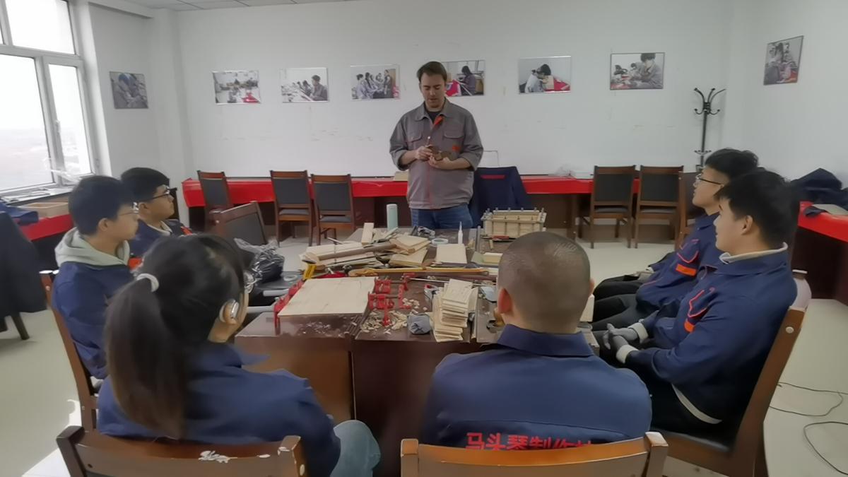 Edward Berger Vennesland Messelt makes a horsehead fiddle in Qian Gorlos Mongolian autonomous county of Songyuan city, Jilin province. [Photo provided to chinadaily.com.cn]