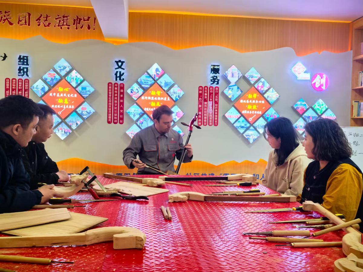 Edward Berger Vennesland Messelt presents a horsehead fiddle he made in Qian Gorlos Mongolian autonomous county of Songyuan city, Jilin province. [Photo provided to chinadaily.com.cn]