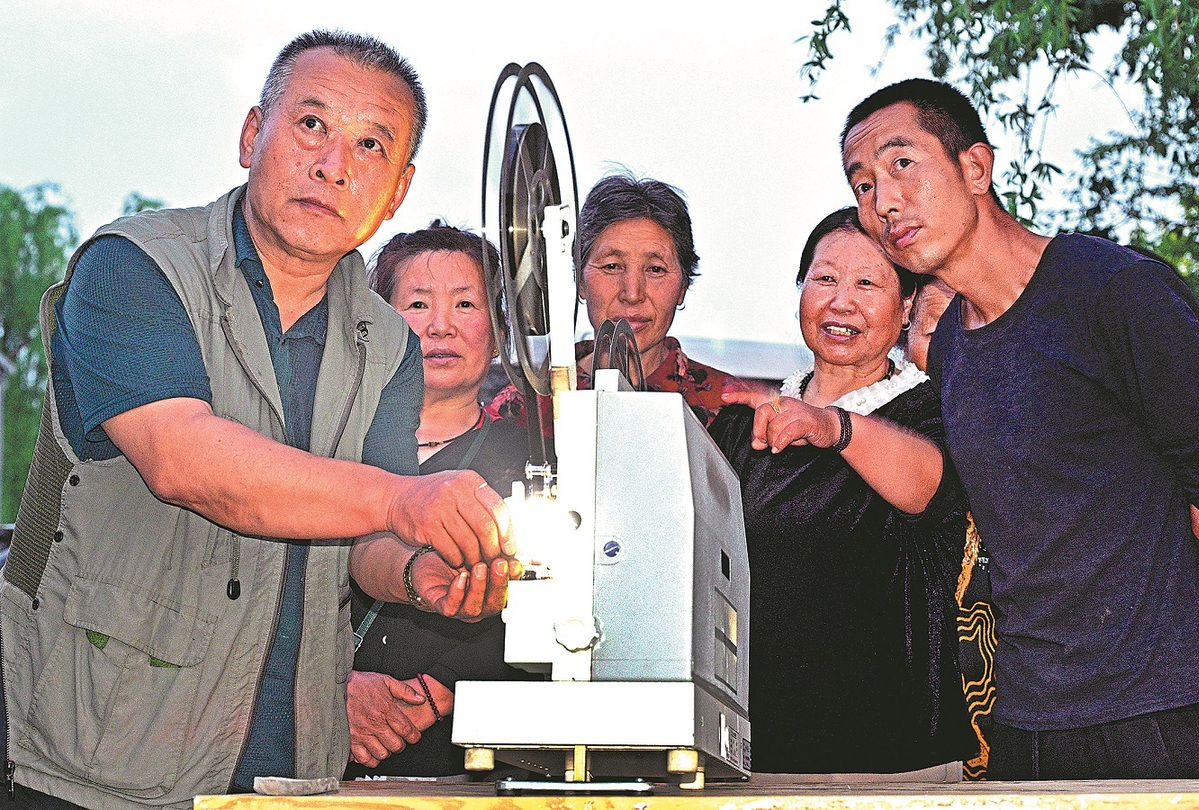 Villagers gather around Zhou (left) before a screening in Yangzhuang village on June 20. LIU TONG/WANG ZHONGXUN/DATONG DAILY